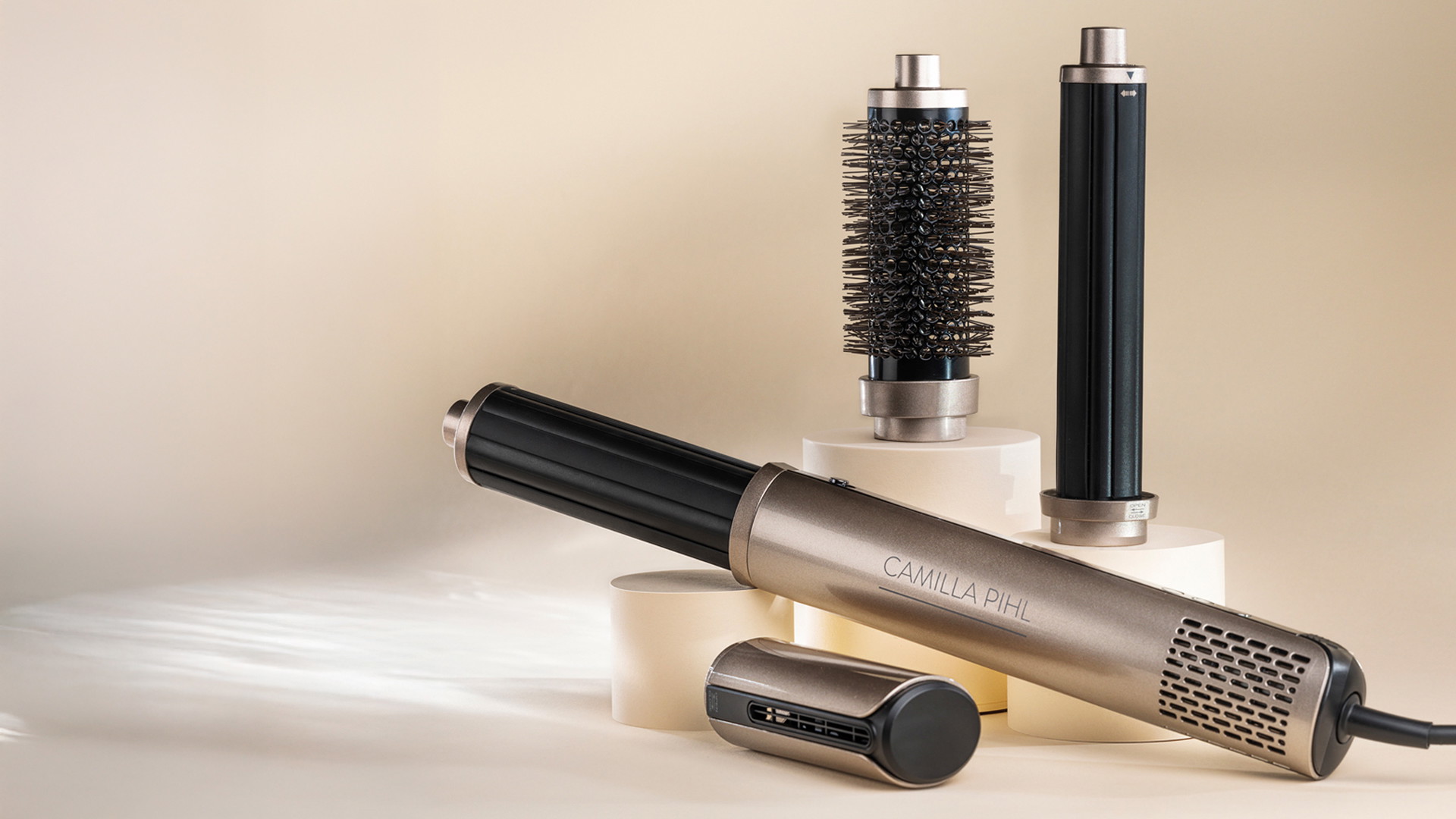Multi-Styler kommer med fire tilbehør (barrels) én som tørker håret, én rundbørste, samt to ulike sylindere som lar deg enkelt endre krølleretning mens du styler håret. Enten du ønsker volumiøse krøller, løse bølger eller nydelig glansfullt hår, gjør dette hårverktøyet stylingen til en drøm.