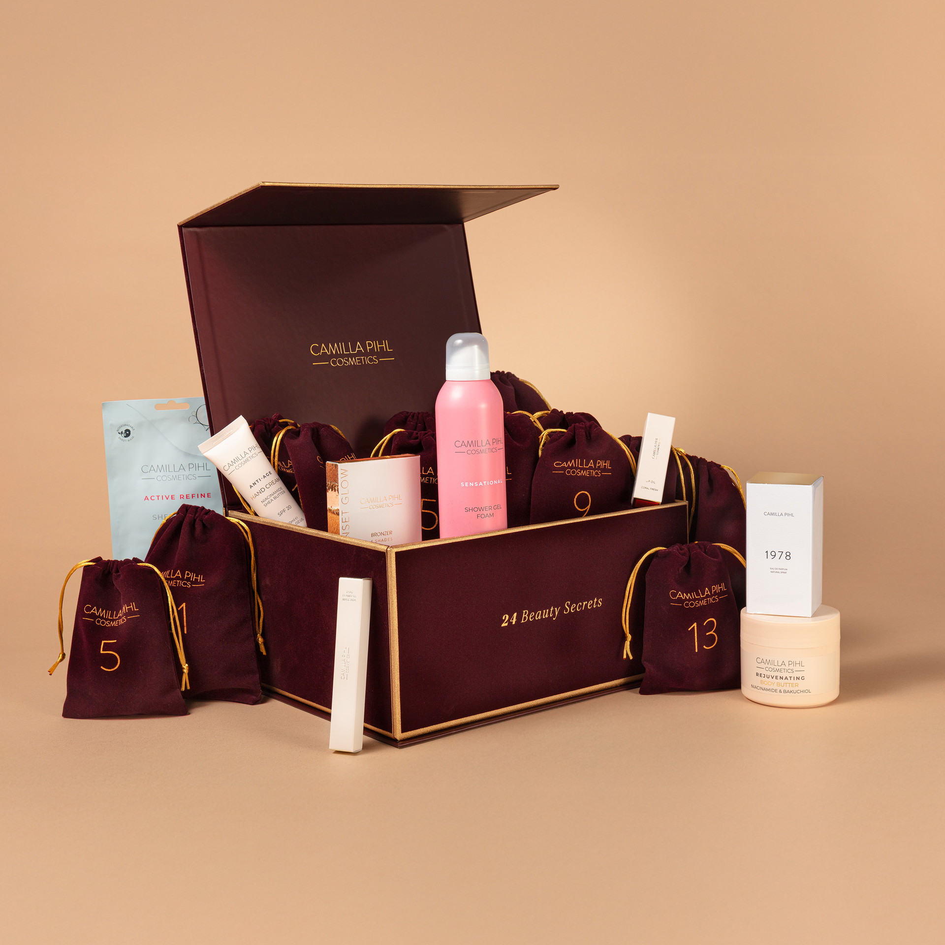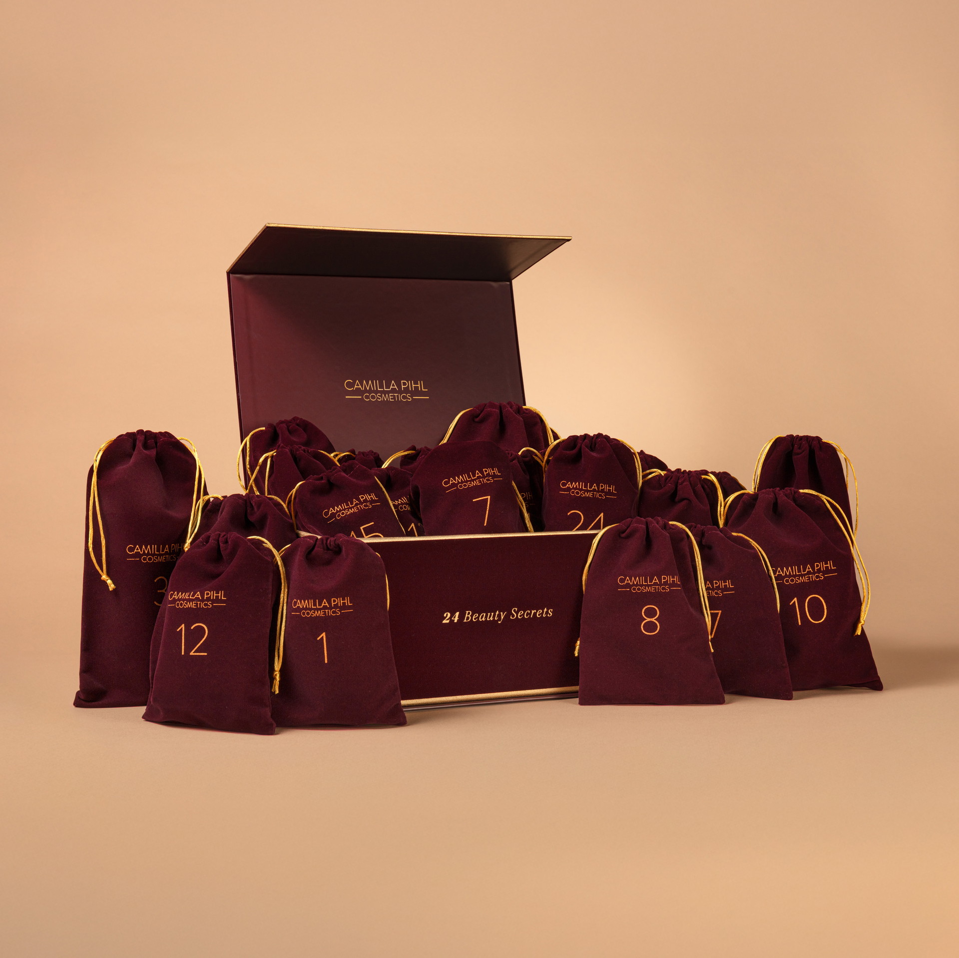 En luksuriøs adventskalender fra Camilla Pihl Cosmetics, med 24 full-size produkter i kategoriene hudpleie, sminke og tilbehør.